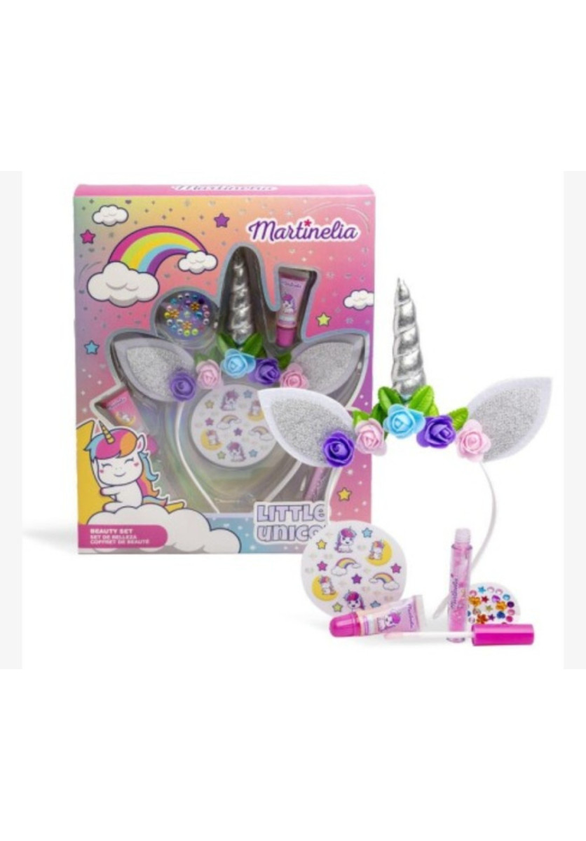 ¡Añade un toque de magia a su día con el MARTINELIA LITTLE UNICORN BEAUTY SET Este encantador set incluye una diadema de unicornio, dos brillos labiales, un brillo labial en tarro, stickers y gemas adhesivas. Perfecto para los pequeños soñadores, este set les permite explorar su creatividad y estilo personal mientras se divierten. La diadema de unicornio añade un toque mágico, mientras que los brillos labiales y los stickers completan su look. Con el Little Unicorn: Sparkle & Shine Set, cada día es una nueva oportunidad para brillar y jugar con un toque de fantasía. ¡Haz que su rutina de belleza sea tan mágica como ellos!